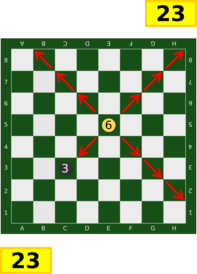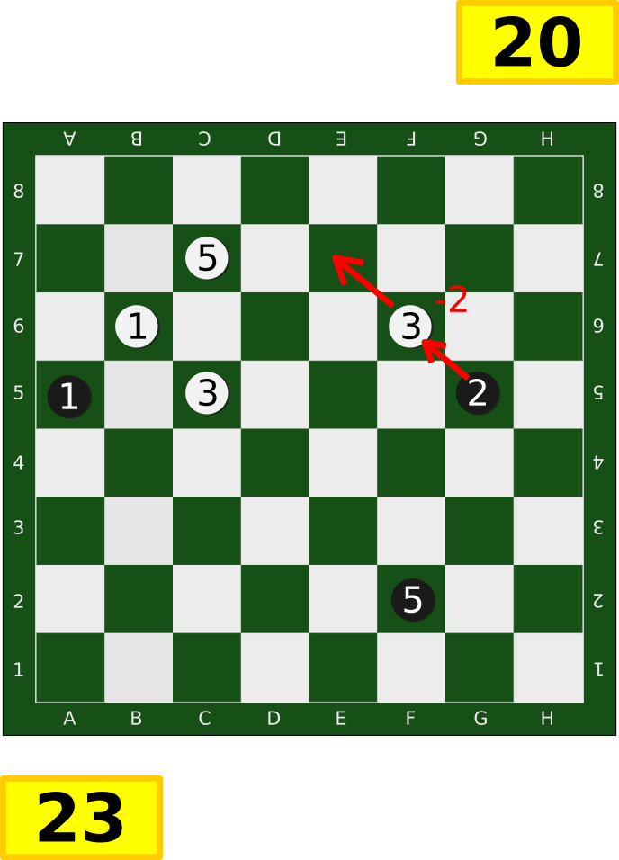Game 23! is played between two players, with 12 white pieces on one side and with 12 black pieces on the other side, each with a specific weight of: 1, 2, 2, 1, 3, 5, 5, 3, 7.11, 11, 7. The initial move is always up to whoever has the white pieces. Each player starts with 23 points.